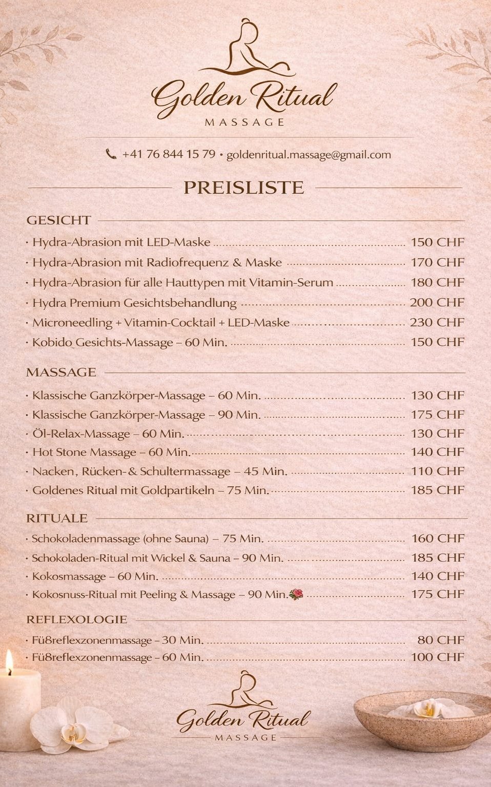 In meinem Studio in Zürich (Kreis 6) finden Sie Behandlungen, die darauf ausgerichtet sind, die Harmonie von Körper und Geist wiederherzustellen. Mein Angebot umfasst Massagen, Facials und sinnliche Rituale mit Inhaltsstoffen wie Kokosnuss, Schokolade und Rose – immer individuell auf Ihre Bedürfnisse abgestimmt.